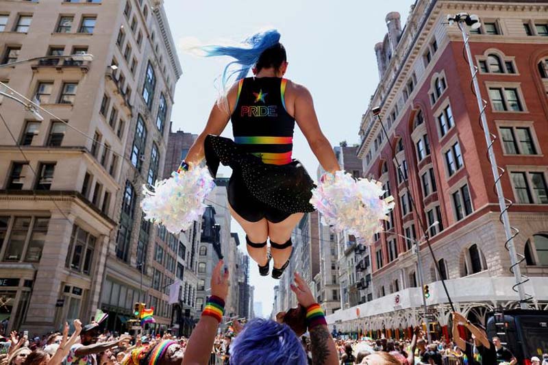 Pride : สมาชิกกลุ่มที่มีความหลากหลายทางเพศ แสดงกิจกรรมเชียร์ท่ามกลางผู้เข้าร่วมจำนวนมาก ในขบวนพาเหรดของกลุ่มที่มีความหลากหลายทางเพศ LGBTQ+ และกลุ่ม Pride ประจำปี ในนครนิวยอร์ก ของสหรัฐฯ