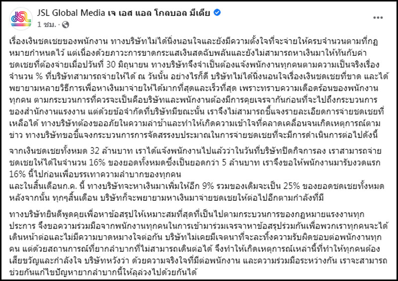 5 ก.ค.65 เพจเฟซบุ๊ก JSL Global Media เจ เอส แอล โกลบอล มีเดีย ออกแถลงการณ์โพสต์ถึงกรณี การยกเลิกจ้างพนักงานและมีการชดเชยยเงินให้ 16% ว่าไม่ได้นิ่งนอนใจ แต่เนื่องด้วยจากขาดกระแสเงินสดฉับพลันทำให้ไม่มีมาจ่ายค่าชดเชยให้กับพนักงานในวันที่ 30 มิ.ย.ที่ผ่านมา