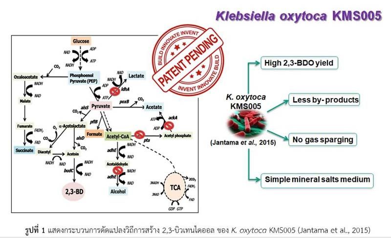 รองศาสตราจารย์ ดร.เขมวิทย์ จันต๊ะมา หัวหน้าโครงการวิจัย เปิดเผยว่า จากการศึกษาค้นคว้าและวิจัยทางด้านเทคโนโลยีชีวภาพ 2,3-บิวเทนไดออล เป็นสารเคมีสำคัญที่ใช้กันอย่างแพร่หลายในอุตสาหกรรมเคมีเพื่อใช้เป็นตัวทำละลาย ตัวประสาน สีทาบ้าน สีทารถยนต์ เม็ดพลาสติก สารเติมแต่งที่ใช้ในผลิตภัณฑ์อาหาร และยา รวมถึงสารเคมีอื่น ๆ ที่ใช้ในครัวเรือนเพื่อการอุปโภค และบริโภค หรือแม้กระทั่งผสมในสารพอลิเมอร์พลาสติกให้มีความแข็งแรงมากขึ้น อีกทั้งในอุตสาหกรรมเชื้อเพลิงชีวภาพ 2,3-บิวเทนไดออล ยังถูกนำไปใช้เป็นสารตั้งต้นในการผลิตเชื้อเพลิงอากาศยาน (bio-jet fuel) อีกด้วย กากน้ำตาล (sugarcane molasses) เป็นผลพลอยได้ในอุตสาหกรรมผลิตน้ำตาลทราย โดยการผลิตน้ำตาลทราย 1 ตัน จะใช้น้ำอ้อยดิบ 10 ตัน และเกิดผลพลอยได้ของกากน้ำตาล ประมาณ 50 กิโลกรัม กากน้ำตาลมีองค์ประกอบของน้ำตาลรวมประมาณ 50% (น้ำหนักต่อปริมาตร)