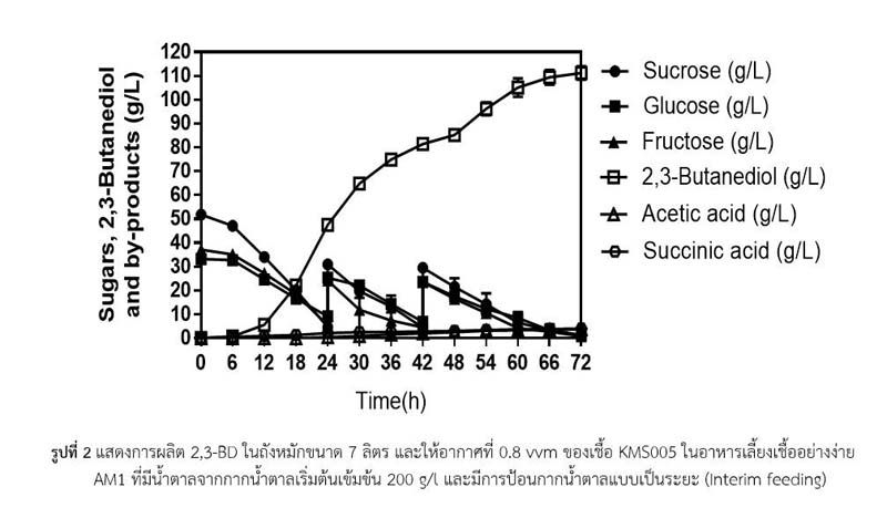 โดยที่จะเป็นซูโครสประมาณ 13% (w/v) (น้ำหนักต่อปริมาตร) และกลูโคสรวมกับฟรุคโตสประมาณ 15% (น้ำหนักต่อปริมาตร) ดังนั้น เพื่อเพิ่มมูลค่าให้กับอุตสาหกรรมอ้อยและน้ำตาล กากน้ำตาลที่เป็นของเหลือใช้จากอุตสาหกรรมการผลิตน้ำตาลที่เกือบไม่มีมูลค่าควรจะถูกนำมาใช้ให้เกิดประโยชน์สูงสุด เช่น นำมาผลิต 2,3-บิวเทนไดออล จาก K. oxytoca KMS005 (Jantama et al., 2015) ที่พัฒนาขึ้นเองด้วยเทคนิควิศวกรรมเมทาบอลิกของมหาวิทยาลัยเทคโนโลยีสุรนารี ซึ่งจะเป็นการยกระดับผลิตภัณฑ์มูลค่าเพิ่ม และสร้างมูลค่าเพิ่มทางเศรษฐกิจจากกากน้ำตาลไปเป็น 2,3-บิวเทนไดออล (มูลค่าในตลาดโลกที่ $US9.12-250/kg ขึ้นกับความบริสุทธิ์) ที่มีการนำไปใช้ในอุตสาหกรรมอื่น ๆ ที่กว้างขวางกว่า เอทานอลที่ถูกผลิตขึ้นจากกากน้ำตาลด้วยยีสต์ในปัจจุบัน ดังนั้น การผลิต 2,3-บิวเทนไดออล จากกระบวนการหมักโดยใช้เชื้อ K. oxytoca KMS005 ด้วยกากน้ำตาลอ้อย น่าเป็นอีกทางเลือกหนึ่งที่จะเพิ่มมูลค่าในห่วงโซ่ธุรกิจอุตสาหกรรมน้ำตาลให้เพิ่มเติม และยังนำไปสู่การพัฒนากลุ่มธุรกิจ New S-curve ของอุตสาหกรรมเชื้อเพลิงชีวภาพ และเคมีชีวภาพ ตามนโยบายรัฐบาลไทยแลนด์ 4.0 กระบวนการดังกล่าวนำไปสู่การลดของเหลือใช้ทางการเกษตรที่มีส่วนประกอบของน้ำตาลซูโครส กลูโคส และฟรุคโต และเป็นการลดการนำเข้า 2,3-บิวเทนไดออลที่มีราคาสูงจากต่างประเทศ เพียงพอต่อความต้องการภายในประเทศ และยังสามารถส่งขายต่างประเทศ ทำให้เกิดการพัฒนาและต่อยอดทางธุรกิจของอุตสาหกรรมเคมีชีวภาพที่ถือเป็นยุทธศาสตร์สำคัญต่อการพัฒนาอุตสาหกรรมเป้าหมายใหม่ของประเทศไทย