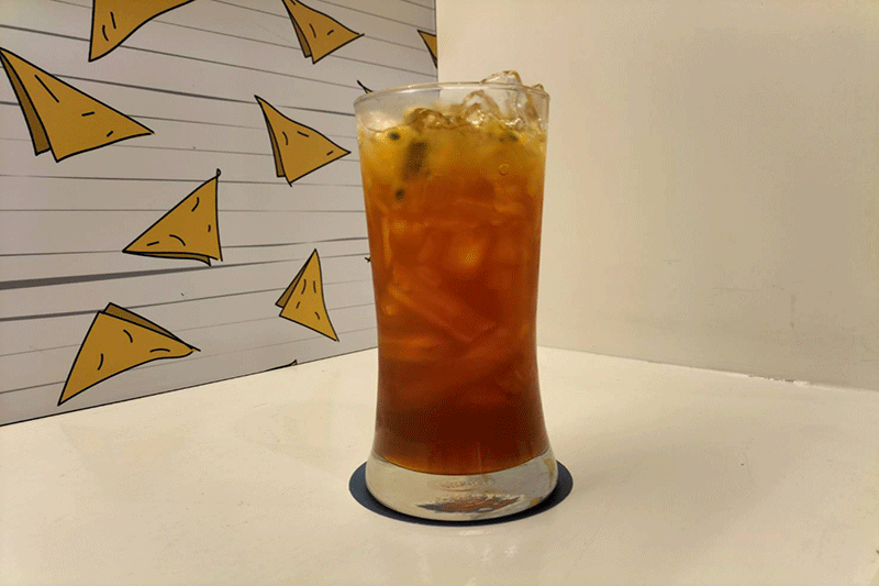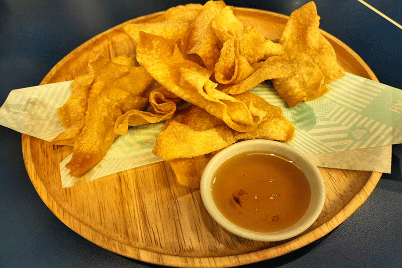สำหรับเมนูอาหารและเครื่องดื่มที่เมื่อเราไปถึงแล้วต้องสั่ง มีดังนี้ ชามะนาวน้ำผึ้งเสาวรส ราคา 95 บาท ดับร้อนได้ทันใจ และเมนูแรกที่เราสั่งคือ “เกี๊ยวกรอบ” ราคา 75 บาท ซึ่งเป็นเมนูแรกที่ทุกคนเวลามาทานที่ร้านสีฟ้าจำเป็นต้องสั่งกิน เราเพิ่งจะรู้ว่าเคล็ดลับความอร่อยของเกี๊ยวกรอบ ร้านสีฟ้า คือ แป้งที่ใช้ทำเกี๊ยวกรอบ เป็นแป้งชนิดเดียวกับแป้งบะหมี่ของสีฟ้า ซึ่งทำมาจากไข่ล้วนๆ ทำให้ตัวแป้งมีความนุ่มเป็นพิเศษจึงทำให้แตกต่างจากเกี๊ยวกรอบทั่วๆ ไป ตามด้วย “ปอเปี๊ยะสด” ราคา 85 บาท เมนูของว่างยอดนิยมอีกหนึ่งเมนู ที่ไส้เครื่องแน่น ทั้งหมูตั้ง เต้าหู้ กุนเชียง ผักต่าง ๆ ราดด้วยน้ำราดที่ปรุงรสจนหอมอร่อย