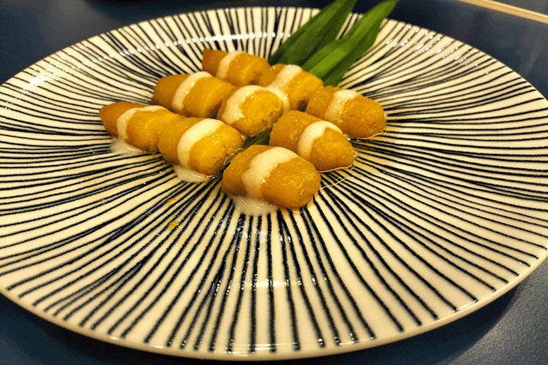 “ข้าวคลุกกะปิ” ราคา 175 บาท เมนูนี้คลาสสิกที่แม้แต่คนชังกะปิยังยอมรับว่า ตำรับสีฟ้าอร่อยจริงๆ เพราะมีข้าวหอมมะลิอินทรีย์จากสุรินทร์เป็นพระเอก คลุกเคล้าจนได้รสเค็มนัวจากกะปิคุณภาพดีของสมุทรสงคราม มีทั้งหมูหวาน กุนเชียงเจ้าเก่าแก่จากเยาวราช ไข่ม้วนรสนุ่ม หอมแดงซอยบาง พริกขี้หนูสดเพิ่มความเผ็ดหอม มะม่วงเปรี้ยวไว้ตัดรส พร้อมถั่วฝักยาว มะเขือเทศราชินี แตงกวาและผักสลัดสดกรอบ คลุกทุกอย่างเข้าด้วยกันเสริมเพิ่มความอร่อย เมื่อกินอิ่มแล้ว เราก็ต่อกันด้วยของหวานล้างปากอย่าง “กล้วยไข่เชื่อม” ราคา 85 บาท เป็นอีกเมนูขนมไทยที่ถึงแม้จะเป็นเมนูง่ายๆ แต่หากินยากขึ้นทุกวัน