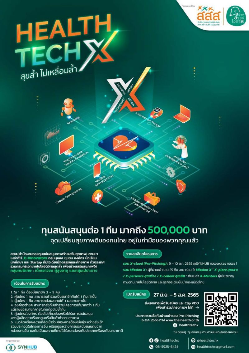 สำหรับผู้สนใจสมัครเข้าร่วมโครงการ “ HEALTHTECH X สุขล้ำ ไม่เหลื่อมล้ำ” สามารถสอบถามรายละเอียดเงื่อนไขการรับสมัคร ได้ที่ Line @ healthtechx , Facebook & Tiktok: healthtechx หรือโทร. 06-5925-6424 สามารถสมัครเข้าร่วมโครงการฯได้ ตั้งแต่วันนี้ – 5 สิงหาคม 2565