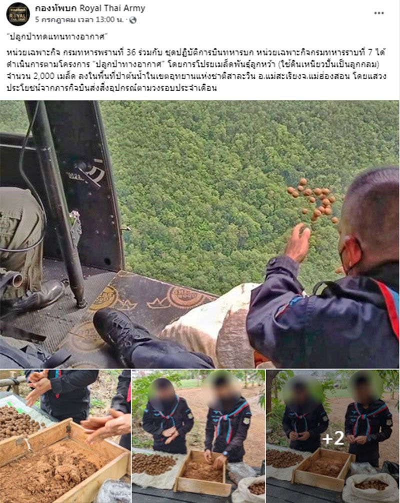 โดยทางเพจระบุว่า หน่วยเฉพาะกิจ กรมทหารพรานที่ 36 ร่วมกับ ชุดปฏิบัติการบินทหารบก หน่วยเฉพาะกิจกรมทหารราบที่ 7 ได้ดำเนินการตามโครงการ “ปลูกป่าทางอากาศ” โดยการโปรยเมล็ดพันธุ์ลูกหว้า (ใช้ดินเหนียวปั้นเป็นลูกกลม) จำนวน 2,000 เมล็ด ลงในพื้นที่ป่าต้นน้ำในเขตอุทยานแห่งชาติสาละวิน อ.แม่สะเรียงจ.แม่ฮ่องสอน โดยแสวงประโยชน์จากภารกิจบินส่งสิ่งอุปกรณ์ตามวงรอบประจำเดือน