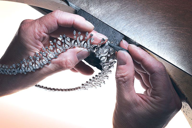 อีกหนึ่งความเชี่ยวชาญที่บ่มเพาะมาใน “Ateliers de l’Extraordinaire” มาอย่างยาวนาน คือศาสตร์แห่งการทำทอง ที่นี่ช่างฝีมือได้นำทองคำมาผ่านกรรมวิธีขึ้นรูปและแกะสลัก เพื่อให้ได้เส้นสายที่อ่อนนุ่มและบางเบาราวกับเส้นไหม หรือจะเป็นดีไซน์อสมมาตรและเส้นสายที่โค้งเว้าของชิ้นงานในเซต Voluptuous Ribbon และ Generous Laces ที่เชิดชูความเชี่ยวชาญของเมซงได้อย่างเหนือจินตนาการ ขณะที่การเจียระไนทรงมาร์คีส์ 55 เหลี่ยม ซึ่งถือเป็นซิกเนเจอร์คัตเลื่องชื่อ ก็ถูกนำมาใช้ทั่วทั้งคอลเลคชั่นเพื่อส่งมอบประกายงามที่แตกต่างและชวนหลงใหลกว่าที่เคย