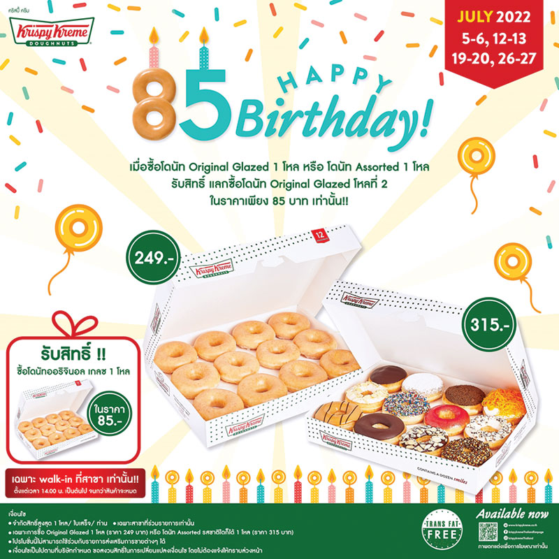 คริสปี้ ครีม ชวนชิมโดนัทสูตรลิขสิทธิ์อันดับ 1 พร้อมโปรฯ “Krispy Kreme 85th Happy Birthday” สุดเซอร์ไพรส์ทุกวันอังคารและวันพุธ ตั้งแต่เวลา 14.00 น. ถึง 31 ก.ค.ที่ ร้านคริสปี้ ครีม สาขาที่ร่วมรายการ