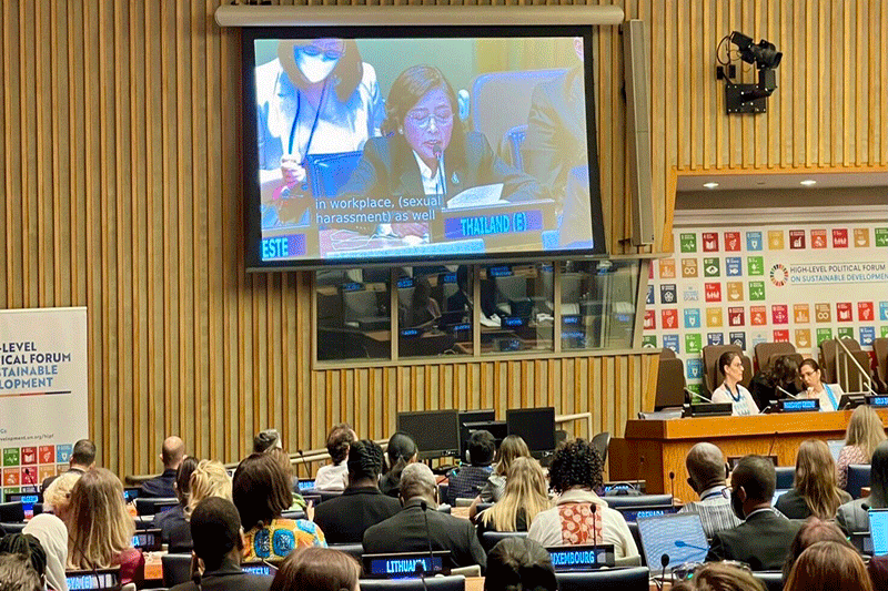 8 กรกฎาคม 2565 นางพัชรี อาระยะกุล ปลัดกระทรวงการพัฒนาสังคมและความมั่นคงของมนุษย์ (ปลัด พม.) นำเสนอผลการดำเนินงานของประเทศไทยในการสร้างความเสมอภาคระหว่างเพศที่สอดคล้องกับเป้าหมายการพัฒนาที่ยั่งยืน (SDGs) เป้าหมายที่ 5 Gender Equality (ความเท่าเทียมทางเพศ) ร่วมกับประเทศสมาชิกสหประชาชาติ ในการประชุมหารือระดับสูงทางการเมืองว่าด้วยการพัฒนาที่ยั่งยืน ประจำปี 2565 (High-level Political Forum on Sustainable Development: HLPF2022) ณ สำนักงานใหญ่สหประชาชาติ นครนิวยอร์ก สหรัฐอเมริกา