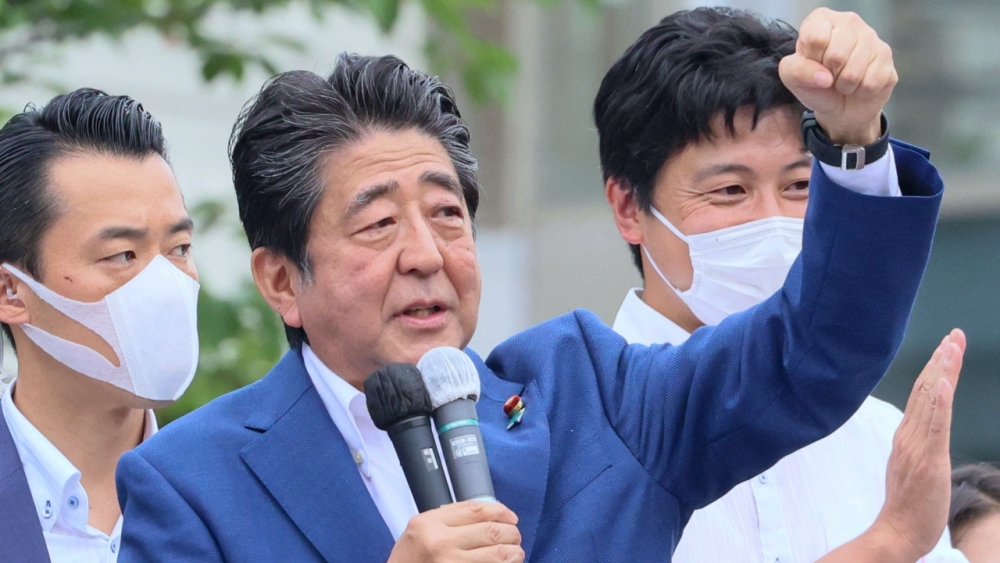 ความคิดเห็นเกี่ยวกับชาตินิยมของเขามักสร้างความตึงเครียดให้กับจีนและเกาหลีใต้ โดยเฉพาะอย่างยิ่งหลังจากที่เขาไปเยือนศาลเจ้ายาสุคุนิในกรุงโตเกียวในปี 2556 ซึ่งเป็นสถานที่ที่มีการโต้เถียงซึ่งเกี่ยวข้องกับการทหารของญี่ปุ่นทั้งก่อนและระหว่างสงครามโลกครั้งที่สอง