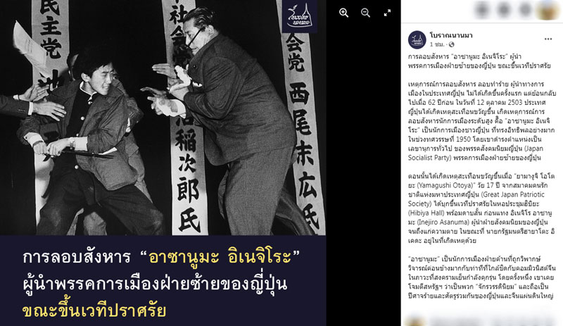 เหตุการณ์การลอบสังหาร ลอบทำร้าย ผู้นำทางการเมืองในประเทศญี่ปุ่น ไม่ได้เกิดขึ้นครั้งแรก แต่ย้อนกลับไปเมื่อ 62 ปีก่อน ในวันที่ 12 ตุลาคม 2503 ประเทศญี่ปุ่นได้เกิดเหตุสะเทือนขวัญขึ้น เกิดเหตุการณ์การลอบสังหารนักการเมืองระดับสูง คืิอ “อาซานูมะ อิเนจิโระ” เป็นนักการเมืองชาวญี่ปุ่น ที่ทรงอิทธิพลอย่างมากในช่วงทศวรรษที่ 1950 โดยเขาดำรงตำแหน่งเป็นเลขานุการทั่วไป ของพรรคสังคมนิยมญี่ปุ่น (Japan Socialist Party) พรรคการเมืองฝ่ายซ้ายของญี่ปุ่น