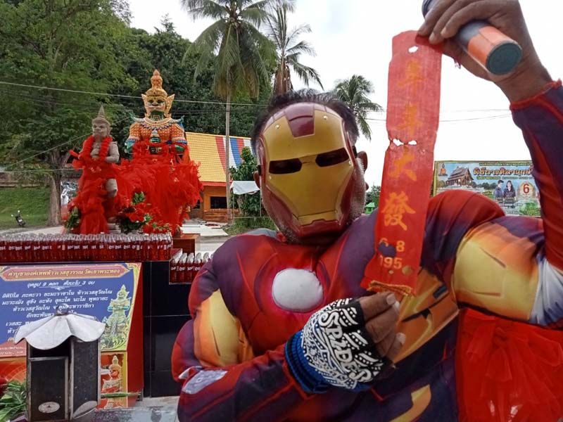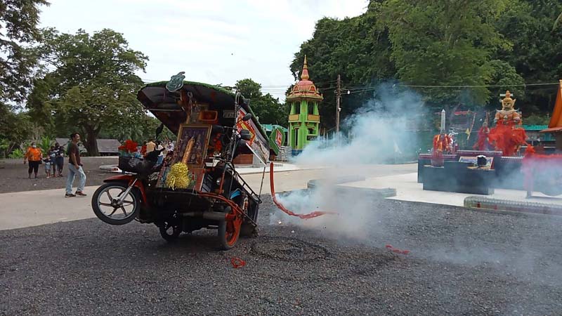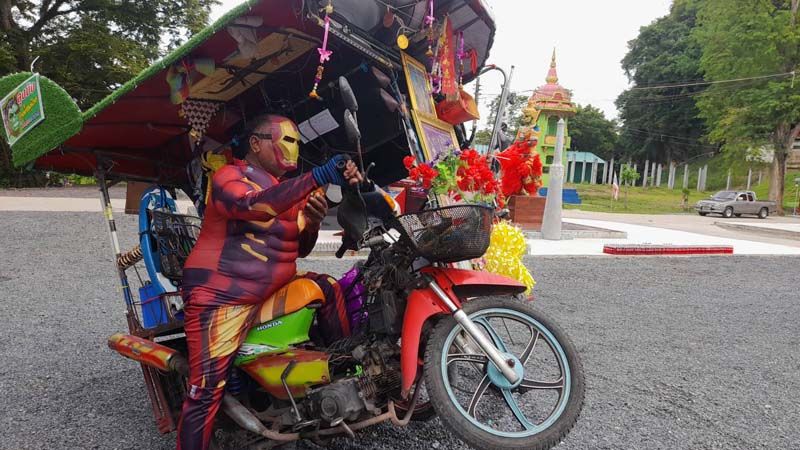 ‘ลุงบัง’ แต่ง ‘ไอรอนแมน’ โชว์ดริฟต์ จยย.พ่วงข้าง จุดประทัดขอเลขเด็ด ‘ท้าวเวสสุวรรณ’