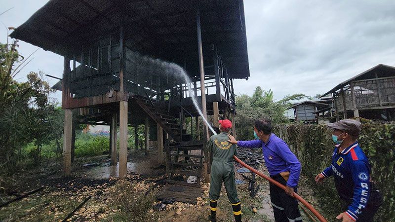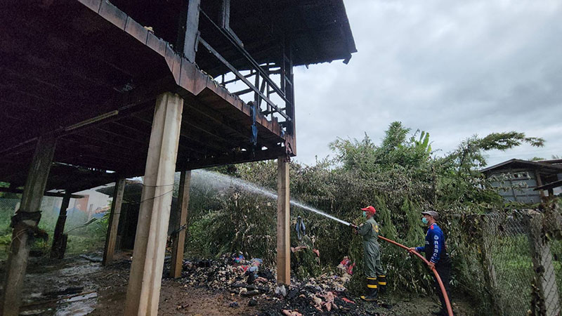 โดยมีรถบรรทุกน้ำของเจ้าหน้าที่กู้ชีพ กู้ภัย รถบรรทุกน้ำดับเพลิงของ อบต.น้ำปั้ว , เทศบาลตำบลทุ่งศรีทอง/เทศบาลตำบลกลางเวียง , อบต.กลางเวียง , อบจ.น่าน , อบต.ตาลชุม , จนท.ชุดเฉพาะกิจอาสาพิทักษ์น่าน , สภ.เวียงสา(ชุดสายฟ้า) และรถบรรทุกน้ำดับเพลิงของ อปท.ในพื้นที่ใกล้เคียงจำนวนหนึ่ง กำลังพยายามควบคุมเพลิงที่กำลังลุกไหม้บ้าน ลักษณะเป็นบ้านชั้นเดียวยกพื้นสูงเสา 12 ต้น หลังขนาดใหญ่