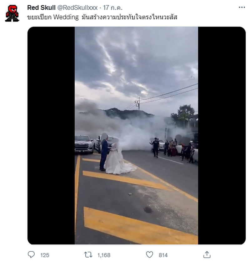 โดยผู้โพสต์ยังระบุแคปชั่นถึงพรีเวดดิ้งครั้งนี้ว่า “ขยะเปียก Wedding มันสร้างความประทับใจตรงไหนวะสัx” ขณะที่คลิปนี้ยังมีชาวเน็ตจำนวนมากเข้าไปแสดงความคิดเห็นวิพากษ์วิจารณ์ถึงการสร้างความเดือดร้อนแถมยังสร้างมลพิษเต็มๆ