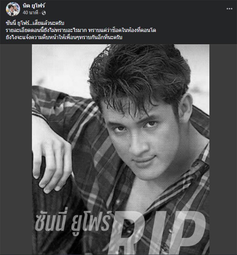 โดยโลกออนน์เพสบุ๊ค นิค ยูโฟร์ โพสต์ภาพและข้อความระบุว่า ซันนี่ ยูโฟร์…เสียแล้วนะครับ รายละเอียดตอนนี้ยังไม่ทราบอะไรมาก ทราบแค่ว่าช็อคในห้องที่คอนโด ยังไงจะแจ้งความคืบหน้าให้เพื่อนๆทราบกันอีกทีนะครับ
