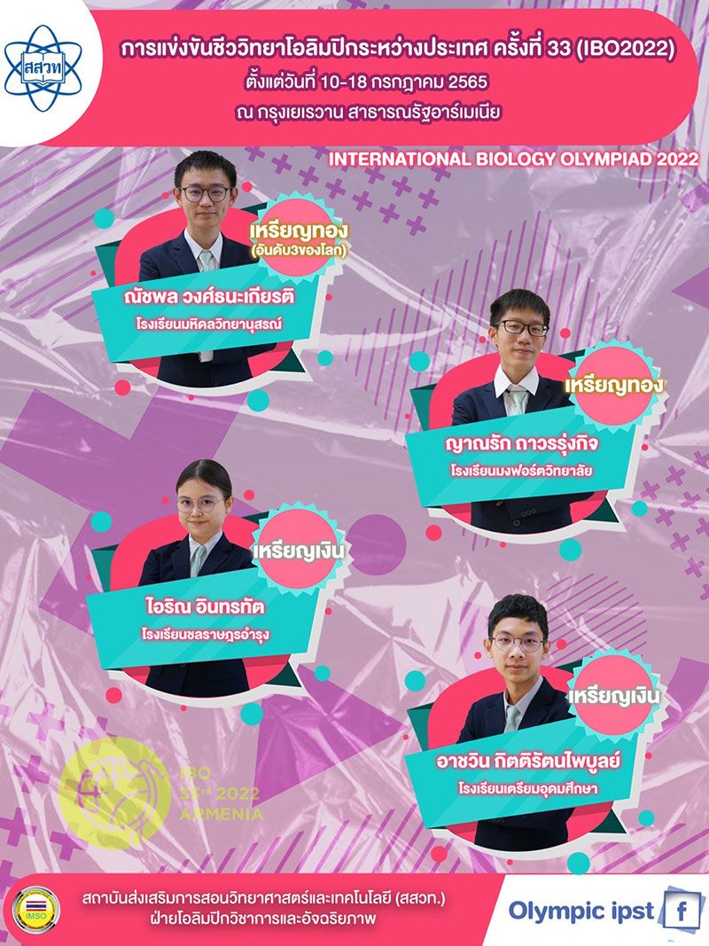 วันที่ 19 กรกฎาคม 2565 ดร.พรชัย อินทร์ฉาย รักษาการผู้อำนวยการ สถาบันส่งเสริมการสอนวิทยาศาสตร์และเทคโนโลยี (สสวท.) เปิดเผยว่า ตามที่ได้คัดเลือกและจัดส่งผู้แทนประเทศไทยไปแข่งขันชีววิทยาโอลิมปิกระหว่างประเทศ ประจำปี ครั้งที่ 33 ประจำปี พ.ศ.2565 (33rd IBO 2022) ณ กรุงเยเรวาน สาธารณรัฐอาร์เมเนีย ระหว่างวันที่ 10 – 18 กรกฎาคม 2565 ผลปรากฏว่าผู้แทนประเทศไทยสามารถทำได้ 2 เหรียญทอง 2 เหรียญเงิน ดังนี้