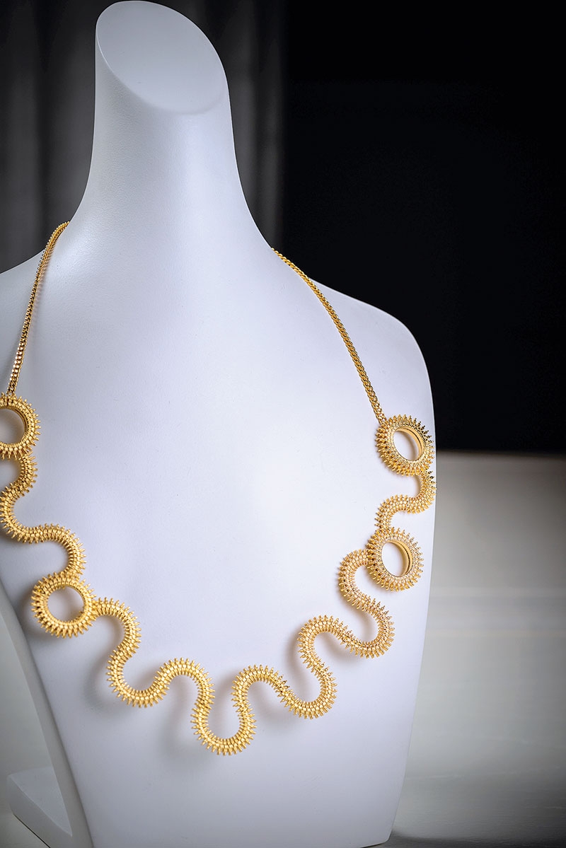 ต่างหูและสร้อยคอทองเครื่องประดับดีไซน์เรียบหรู สามารถจับคู่ mix & match กับทุกสไตล์การแต่งตัว และสวมใส่ได้ทุกโอกาส ซึ่งได้แรงบันดาลใจจากผ้าบาติกลาย ลิมาร์ เกดาตน แห่งโรงเขียนผ้าของนางแวน ลาริก แวน แพบสต์ (เมืองยอกยาการ์ตา) หนึ่งในลายโบราณตระกูลชินเดน โดยคำว่า“เกดาตน” หมายถึงที่พักของเจ้าผู้ครองเมือง ซึ่งเป็นศูนย์กลางการปกครองของแต่ละเมือง