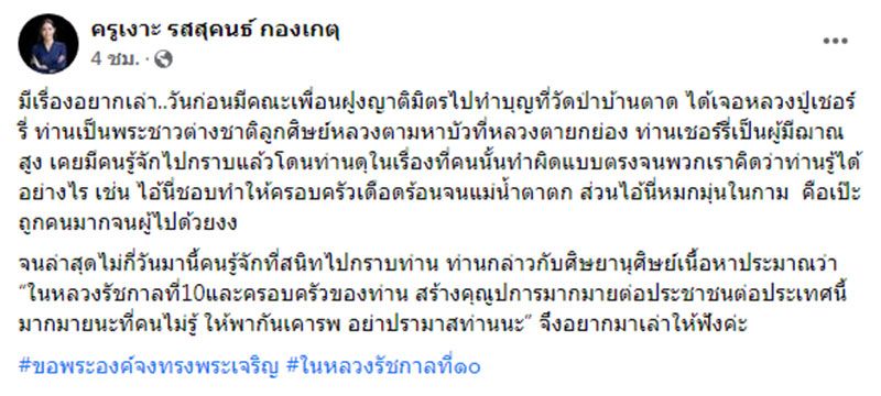 จนล่าสุดไม่กี่วันมานี้คนรู้จักที่สนิทไปกราบท่าน ท่านกล่าวกับศิษยานุศิษย์เนื้อหาประมาณว่า “ในหลวงรัชกาลที่ 10 และครอบครัวของท่านสร้างคุณูปการมากมายต่อประชาชนต่อประเทศนี้ มากมายนะที่คนไม่รู้ ให้พากันเคารพ อย่าปรามาสท่านนะ” จึงอยากมาเล่าให้ฟังค่ะ