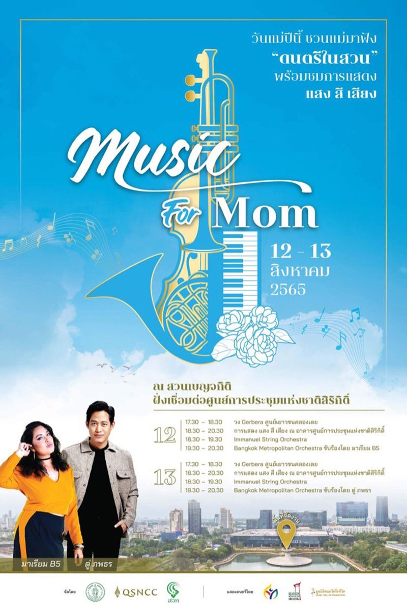 ผู้สนใจสามารถเข้าร่วมกิจกรรม “Music for Mom” ในวันศุกร์ที่ 12 ถึงวันเสาร์ที่ 13 สิงหาคม 2565 ณ สวนเบญจกิติ ฝั่งเชื่อมต่อศูนย์การประชุมแห่งชาติสิริกิติ์ โดยไม่มีค่าใช้จ่าย สอบถามข้อมูลเพิ่มเติมได้ที่โทร 0-2229-3112 และที่ Facebook QSNCC