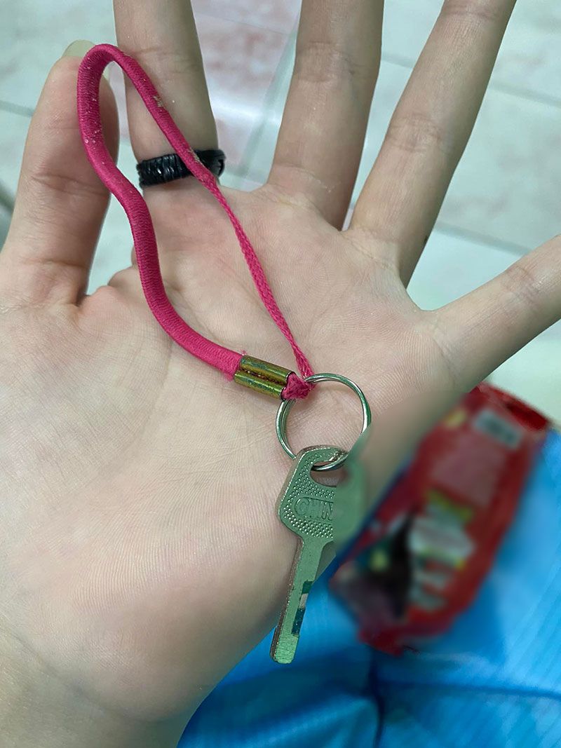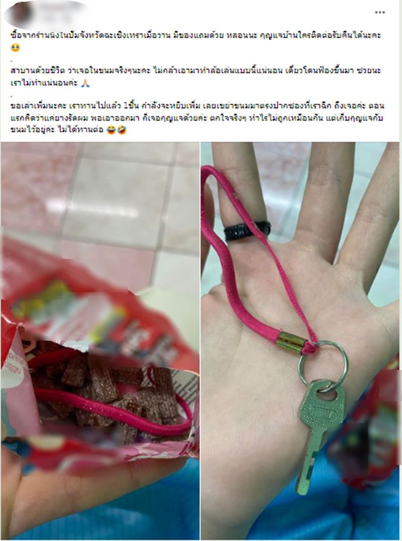 โดยระบุข้อความว่า ‘ซื้อจากร้านหนึ่งในปั๊มจังหวัดฉะเชิงเทราเมื่อวาน มีของแถมด้วย หลอนนะ กุญแจบ้านใครติดต่อรับคืนได้นะคะ สาบานด้วยชีวิต ว่าเจอในขนมจริง ๆ นะคะ ไม่กล้าเอามาทำเล่น ๆ แบบนี้แน่นอน เดี๋ยวโดนเขาฟ้องได้ เราไม่ทำแน่นอนค่ะ’