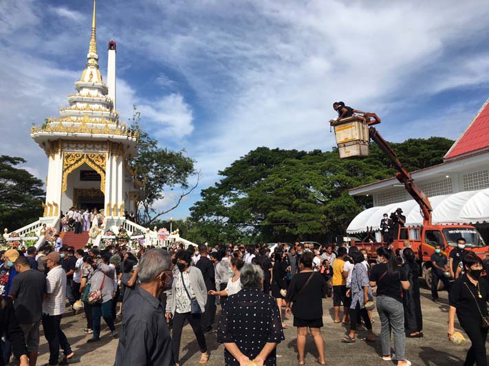 โดยก่อนจะเริ่มพิธีฌาปนกิจ มีการนิมนต์พระสงฆ์จำนวน 90 รูปสวดมาติกา-บังสุกุล ต่อด้วยการแสดงของวงปี่พาทย์ชื่อดัง สลับกับโชว์เดี่ยวแซกโซโพน พร้อมรำอวยพร ก่อนที่ผู้ใหญ่ช้าง นายชยุตม์ อ่อนตา น้องคนสุดท้อง และพี่ชายอีก 2 คนจะร่วมกันร้องเพลงไว้อาลัยให้คุณพ่อเป็นครั้งสุดท้ายสร้างความประทับใจให้กับคนที่มาร่วมในพิธีครั้งนี้จนหลายคนเกือบจะกลั้นน้ำตาไว้ไม่อยู่ และหลังพิธีฌาปนกิจเสร็จลง ทางเจ้าภาพได้จัดให้มีการโปรยทานโดยใช้รถกระเช้าของทางเทศบาล ยกขึ้นโปรยธนบัตรจำนวน 25,000 บาท ชาวบ้านในพื้นที่บอกว่าถือเป็นงานพิธีที่ลูกๆ จัดให้คุณพ่ออย่างยิ่งใหญ่อย่างที่ไม่เคยมีใครจัดมาก่อน