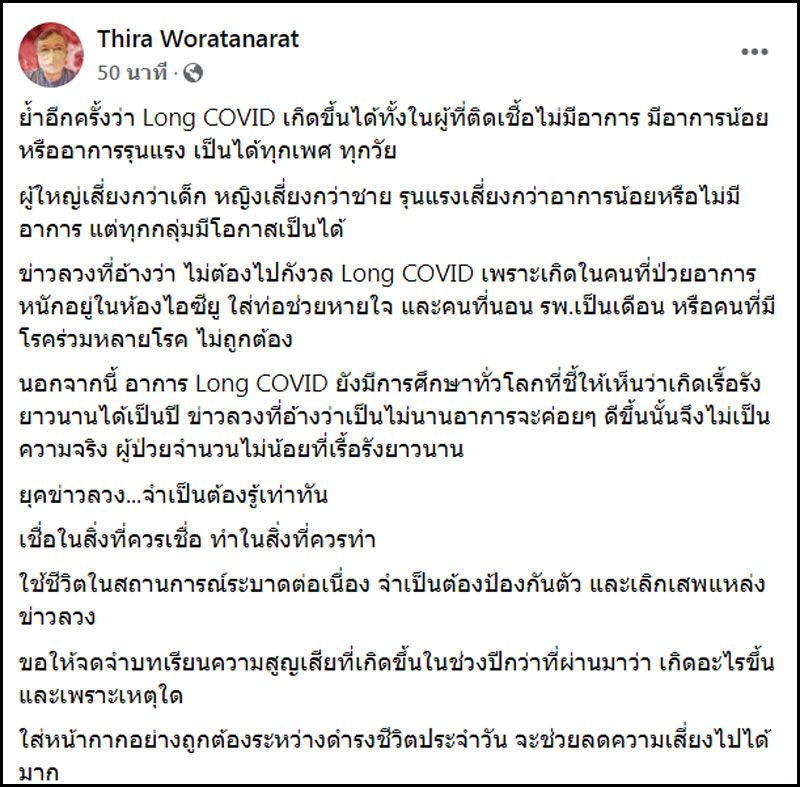 ‘หมอธีระ’ชี้ Long COVID เกิดได้ทุกคน อย่าหลงเชื่อข่าวลวง ขอให้จดจำบทเรียนความสูญเสียที่เกิดขึ้นในช่วงปีกว่าที่ผ่านมาว่า เกิดอะไรขึ้น