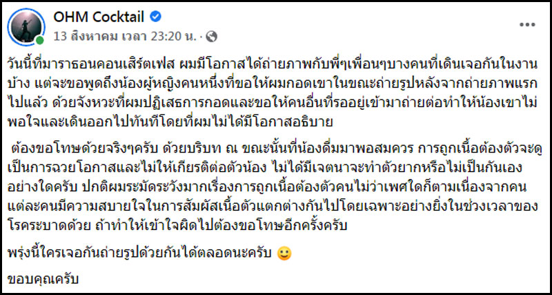 โอม คอกเทล โพสต์ชี้แจง หลังปฏิเสธการกอด ไม่มีเจตนาทำตัวยากต่อแฟนเพลง