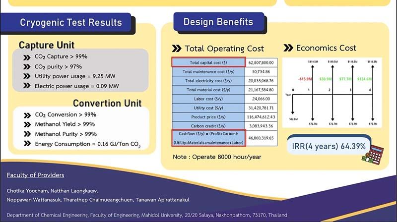 เมื่อเร็วๆ นี้ “กลุ่มนักศึกษาวิศวกรรมเคมี คณะวิศวกรรมศาสตร์ มหาวิทยาลัยมหิดล” ประกอบด้วย น.ส.โชติกา อยู่แจ่ม นายธราเทพ ไชยเมืองชื่น นายณัฐธัญ ละอองแก้ว น.ส.ธนาวรรณ อภิรัตนกุล และ น.ส.นพวรรณ วัฒนสุข โดยมี ผศ.ดร.วีรวุฒิ ชัยวัฒน์อาจารย์ภาควิชาวิศวกรรมเคมี เป็นอาจารย์ที่ปรึกษา ร่วมคิดค้น “กระบวนการดักจับก๊าซคาร์บอนไดออกไซด์ด้วยวิธีไครโอเจนิค (Cryogenic Carbon Capture)” เพื่อลดปริมาณก๊าซคาร์บอนไดออกไซด์ และยังคิดไกลนำไปใช้ต่อในกระบวนการผลิตเมทานอลได้อีกด้วย