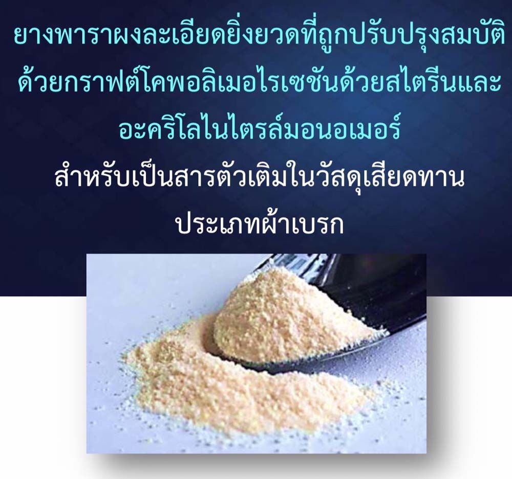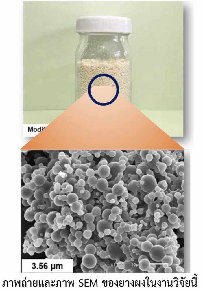 ศาสตราจารย์ ดร.ศราวุธ ริมดุสิต อาจารย์ภาควิชาวิศวกรรมเคมี คณะวิศวกรรมศาสตร์ จุฬาลงกรณ์มหาวิทยาลัย เปิดเผยว่า ได้ร่วมกับทีมวิจัยจากมหาวิทยาลัยศรีนคริทรวิโรฒ และบริษัท SCG โดยการสนับสนุนจาก วช. ในการพัฒนาอนุภาคยางพาราผงละเอียดยิ่งยวด ด้วยการกราฟต์โคพอลิเมอไรเซชั่นสไตรีนอะคริโลไนไตล์ลงบนน้ำยางธรรมชาติผ่านกระบวนการอิมัลชั่นพอลิเมอร์ไรเซชั่น และนำไปผ่านกระบวนการเชื่อมขวางด้วยลำอิเล็กตรอน เพื่อผลิตเป็นอนุภาคยางพาราผงธรรมชาติละเอียดยิ่งยวดด้วยกระบวนการอบแห้งและพ่นฝอย โดยในปฏิกิริยากราฟต์โคพอลิเมอร์ไรเซชั่นด้วยสไตรีนและอะคริโลไนไตรล์สูงอยู่ที่ 71 % และมีประสิทธิภาพในการทำกราฟต์โคพอลิเมอไรเซชั่นสูงถึง 63%