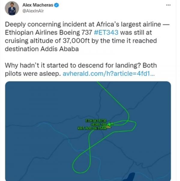 ตามรายงานของสื่อด้านการบิน ‘Aviation Herald’ ระบุว่า เที่ยวบินที่เกิดเหตุการณ์นี้ เป็นเที่ยวบิน ET343 จากกรุงคาทูม เมืองหลวงของประเทศซูดาน ไปยังกรุงอาดดิส อบาบา เมืองหลวงเอธิโอเปีย โดยเจ้าหน้าที่หอควบคุมการบินได้พยายามติดต่อนักบิน แต่ไม่ประสบความสำเร็จ จนในที่สุด นักบินทั้งสองคนได้ถูกปลุกให้ตื่น เนื่องจากระบบออโต้ไพล็อต ส่งเสียงเตือน