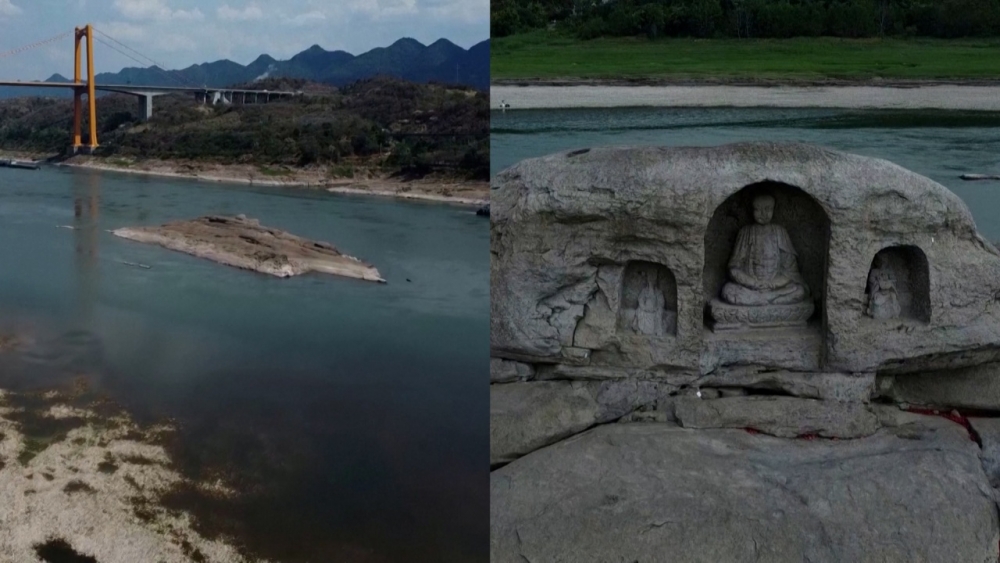 ระดับน้ำในแม่น้ำแยงซีในจีน ลดลงอย่างรวดเร็ว จากปัญหาภัยแล้ง และสภาพอากาศร้อนจัดต่อเนื่อง จนมองเห็นพระพุทธรูปเก่าแก่อายุ 600 ปี ที่เคยจมใต้น้ำ