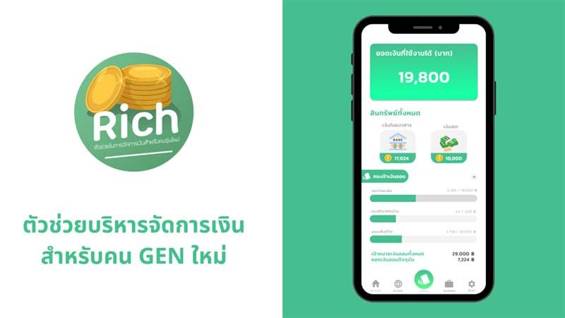 “Rich ตัวช่วยบริหารเงินสำหรับคน Gen ใหม่” เป็นแอปพลิเคชั่นตัวช่วยในการบริหารจัดการเงินให้ง่ายขึ้น ประหยัดเวลาขึ้น มีฟังก์ชั่นใช้งานที่แตกต่างจากแอปที่มีอยู่ทั่วไป ตรงที่มีฟังก์ชั่นช่วยในเรื่องการออมเงิน สามารถสร้างกระเป๋าเงินออมได้ มีการรวบรวมข่าวสารเกี่ยวกับทุนการศึกษาหรือการทำงานพาร์ตไทม์ ที่สำคัญยังทำหน้าที่คอยแนะนำการใช้จ่ายเหมือนเป็นที่ปรึกษาเรื่องการเงินได้อีกด้วย ซึ่งในอนาคตทีมจะพัฒนารูปแบบและพัฒนาตัว AI ให้มีความสามารถมากขึ้นต่อไป