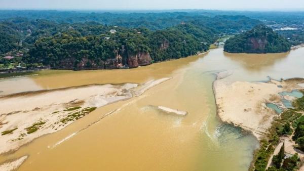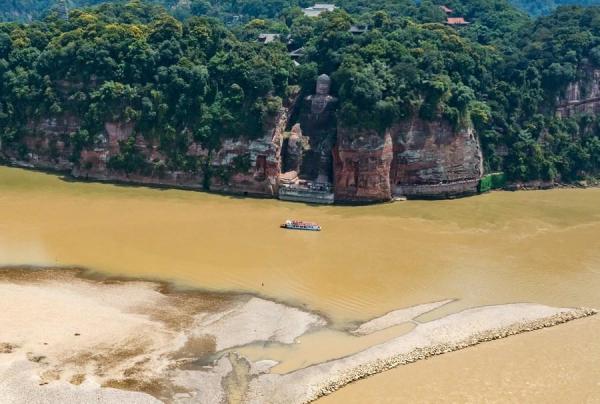 แม่น้ำสาขา 3 สายของแม่น้ำแยงซี ในจีน ลดระดับ จากภัยแล้งจัด ส่งผลให้ส่วนฐานของพระใหญ่เล่อซาน ริมหน้าผาภูเขาเล่อซาน