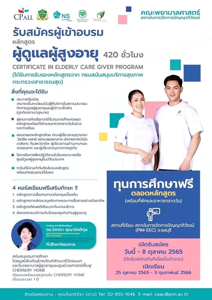 คณะพยาบาลศาสตร์ สถาบันการจัดการปัญญาภิวัฒน์ (พีไอเอ็ม) ร่วมกับ มูลนิธิเจริญโภคภัณฑ์พัฒนาชีวิตชนบทและโรงพยาบาลผู้สูงอายุและศูนย์เวชศาสตร์ฟื้นฟู CHERSERYHOME รับสมัครผู้เข้าอบรมหลักสูตรระยะสั้น “ผู้ดูแลผู้สูงอายุ 420 ชั่วโมง”หลักสูตรได้รับการรับรองจากกรมสนับสนุนบริการสุขภาพ กระทรวงสาธารณสุข ถ่ายทอดองค์ความรู้จากผู้เชี่ยวชาญทุกสาขาวิชาชีพ เสริม 4 ทักษะสำคัญ ภาษาอังกฤษพื้นฐาน การพัฒนาบุคลิกภาพ การสื่อสารปรับ Mindset เชิงบวกต่องานบริการ และเทรนด์ธุรกิจด้านผู้สูงอายุ
