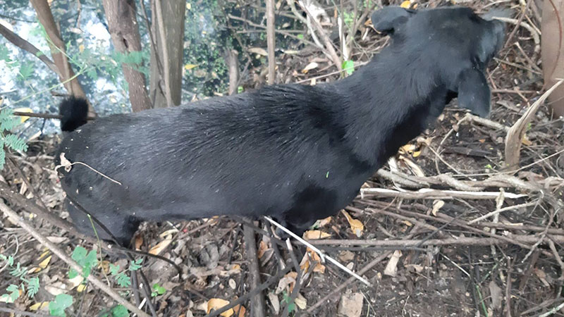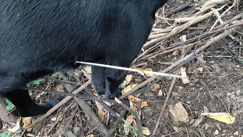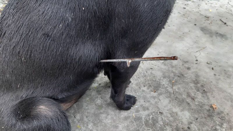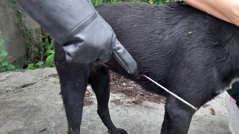 ที่เกิดเหตุพบสุนัข เพศเมีย สีดำ อายุ 2 ปี หลบอยู่ในป่าหญ้า เจ้าหน้าที่จึงช่วยออกมา พบว่ามีเหล็กฉมวกที่ใช้กับปืนยิงปลาความยาวกว่า 30 เซนติเมตร เจ้าหน้าที่กู้ภัยจงช่วยพันแผลและนำส่งโรงพยาบาลสัตว์หมอพลอย เพื่อช่วยเหลือผ่าตัดนำเหล็กออก