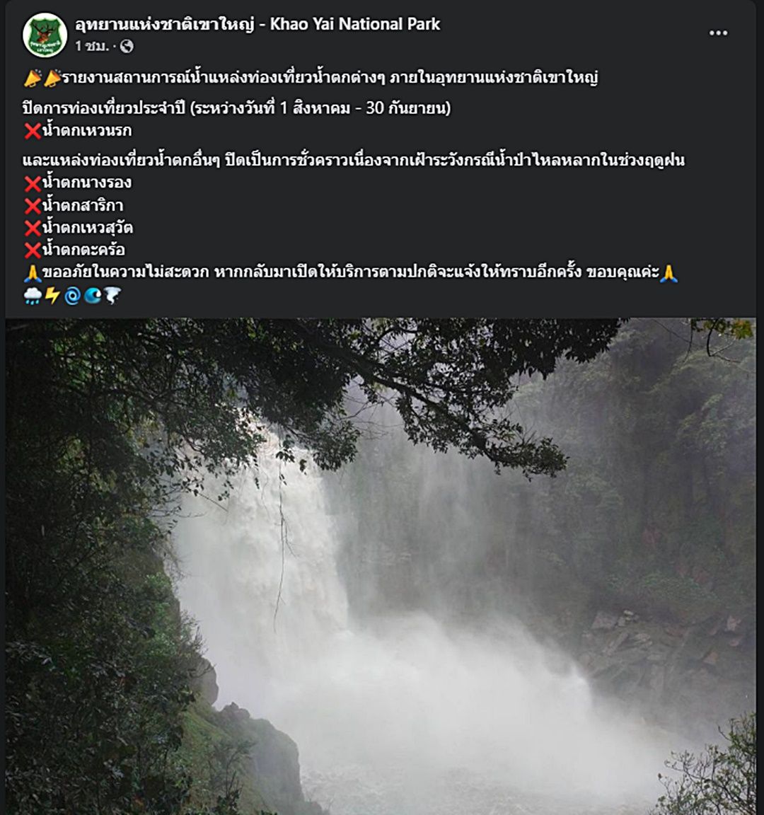 วันที่ 26 ส.ค.65 เพจ “อุทยานแห่งชาติเขาใหญ่ – Khao Yai National Park” ได้โพสต์ข้อความรายงานสถานการณ์น้ำแหล่งท่องเที่ยวน้ำตกต่างๆ ภายในอุทยานแห่งชาติเขาใหญ่ และปิดการท่องเที่ยวประจำปี ระหว่างวันที่ 1 สิงหาคม – 30 กันยายน ประกอบด้วย “น้ำตกเหวนรก” และแหล่งท่องเที่ยวน้ำตกอื่นๆ ปิดเป็นการชั่วคราวเนื่องจากเฝ้าระวังกรณีน้ำป่าไหลหลากในช่วงฤดูฝน “น้ำตกนางรอง น้ำตกสาริกา น้ำตกเหวสุวัต น้ำตกตะคร้อ” – 003