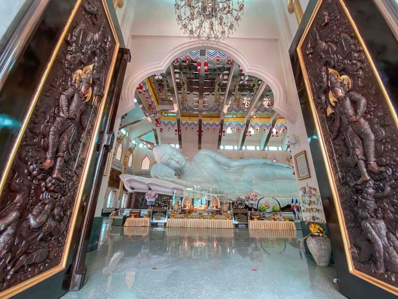 พระวิหารจะมีลักษณะเป็นสถาปัตยกรรมไทยประยุกต์สมัยรัตนโกสินทร์ ภายในพระวิหารประดิษฐานองค์พระพุทธไสยาสน์โลกนาถศาสดามหามุนี แกะสลักจากหินอ่อนอิตาลี องค์พระมีความยาว 20 เมตร ส่วนรอบฐานองค์พระ และรอบๆ ผนัง มีภาพพุทธประวัติและภาพทศชาติ อีกทั้งตกแต่งแบบภาพปั้นนูนต่ำหล่อด้วยทองแดงจากนั้นเดินเท้าเข้าป่าศึกษาธรรมชาติ เที่ยวอุทยานแห่งชาตินายูง-น้ำโสม ไฮไลท์สำคัญของที่นี่อยู่ที่น้ำตกยูงทอง น้ำตกตั้งอยู่บนสันเขาภูพานและภูย่าอู ไหลผ่านโขดหินมีความสูง 40 เมตร เป็นแหล่งต้นน้ำของลำห้วยหลาย, น้ำตกตาดน้อย ตัวน้ำตกจะเป็นสายน้ำสองสายมาบรรจบกันคือ ห้วยวังแดนและห้วยวังบอน จุดสุดท้ายก็ต้องไม่พลาดจุดชมวิวพระอาทิตย์ตกดินที่ ผาแดง ซึ่งเป็นจุดชมวิวที่สวยที่สุดของอุทยานฯ พิกัดสุดท้ายของทริปมาอยู่กันที่หมู่บ้านคีรีวงกต ไฮไลท์ของที่นี่ก็ต้องมานั่งรถอีแต๊กลุยไปตามลำธาร พร้อมกับสัมผัสวิถีชีวิตของคนในชุมชน ปลายทางการนั่งรถอีแต๊กอยู่ที่น้ำตกห้วยช้างพลาย ซึ่งสามารถลงเล่นน้ำได้ หรือจะนั่งเอาเท้าลงแช่ให้ปลานวดเท้าให้ก็ยังได้ ได้เข้ามาถึงน้ำตกก็ต้องมากินอาหารสไตล์บุฟเฟ่ต์ ท่ามกลางผืนป่ากับเมนูอาหารพื้นบ้าน และยังใช้ภาชนะจากธรรมชาติอีกด้วย ได้ฟิวรักษ์ธรรมชาติไปเต็มๆ