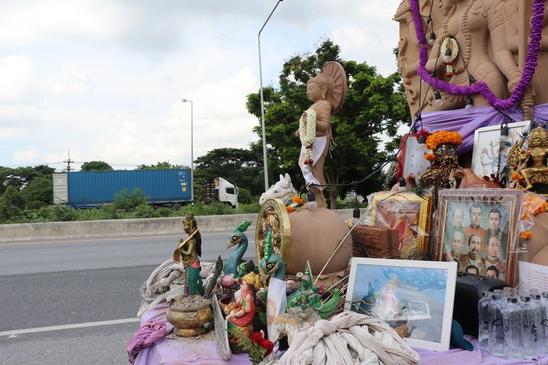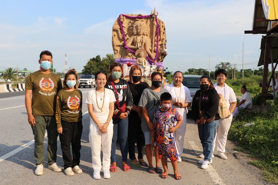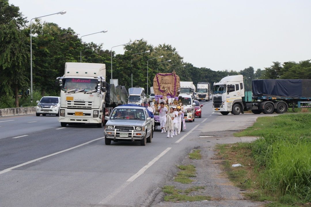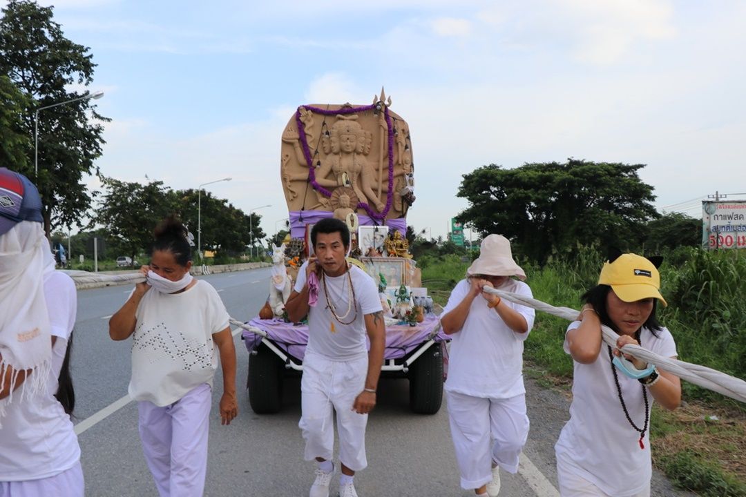 วันที่ 27 ส.ค.65 ที่บริเวณถนนสายเอเซีย อำเภอไชโย จังหวัดอ่างทอง พบอาจารย์เจ หรือนายจักรรินทร์ รังสิมันต์ธนากร พร้อมลูกศิษย์หญิงสาวแต่งกายด้วยชุดขาวร่วม 20 คน ช่วยกันลากจูงราชรถที่บรรทุก “พระศรีอริยเมตไตรย” ทำด้วยหินแกะสลักน้ำหนักกว่า 800 กิโลกรัม และ “พระแม่ศรีมหาตารา” ที่แกะสลักด้วยหินหนักกว่า 3,500 กิโลกรัม รวมนำหนักองค์พระและราชรถกว่าา 5,000 กิโลกรัมลากจูงด้วยคนไปตามเส้นทางถนนสายเอเซีย หากขึ้นสะพานสูงๆ หรือที่ลาดชันก็จะใช้รถยนต์ช่วยในการลากจูงสร้างความฮือฮาให้กับประชาชนที่พบเห็นพร้อมร่วมบุญในเส้นทางที่พบเจอ โดยมีเจ้าหน้าที่มูลนิธิร่วมกตัญญูดูแลความปลอดภัยในการเดินทาง