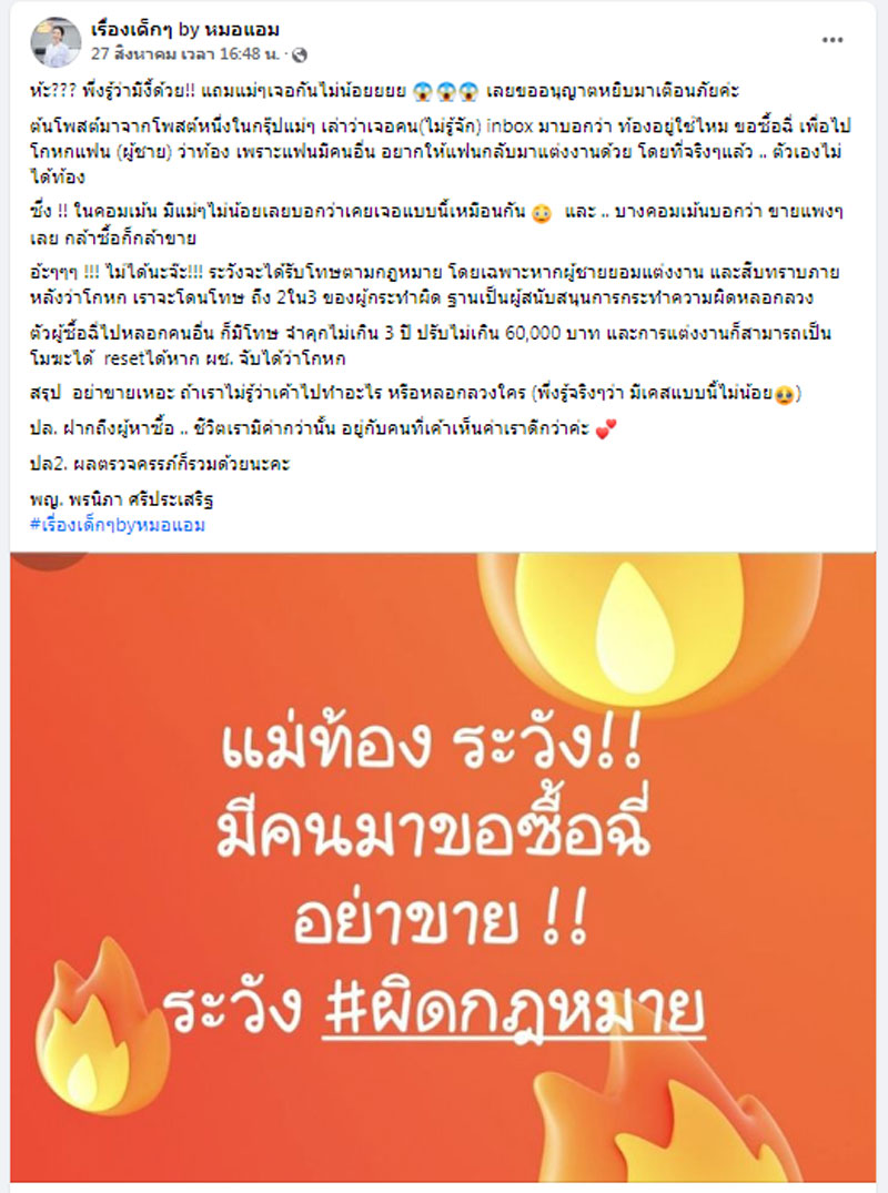 ไปกันใหญ่แล้ว! เรื่องนี้กำลังถูกวิพากษ์วิจารณ์ในสังคมออนไลน์ โดยเพจเฟซบุ๊ก เรื่องเด็กๆ by หมอแอม ได้โพสต์ประเด็นการซื้อ-ขายฉี่ของหญิงตั้งครรภ์ หรือ ผลตรวจครรภ์ เพื่อนำไปโกหกแฟนให้กลับมาแต่งงานด้วย ซึ่งพบว่ามีเคสนี้อยู่เรื่อยๆและกลายเป็นกระแสอยู่ในขณะนี้