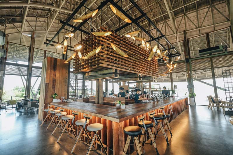 โดยตรงกลางเป็นร้านกาแฟรูปใบไม้ 2 ใบวางซ้อนกัน หลังคาเป็นแฝกเทียมตกแต่งภายในด้วยไม้เก่าเป็นหลัก แต่แฝงไปด้วยความพรีเมี่ยม กระจกบานใหญ่ที่สูงถึงหลังคาเพื่อให้ความรู้สึกกว้างโปร่งสบาย ให้ความรู้สึกผ่อนคลายใกล้ชิดกับธรรมชาติและมองเห็นวิวของสวนดอกไม้ สวนไม้ร่มรื่น และวิวภูเขา ทำให้ลูกค้ารู้สึกผ่อนคลายและดื่มด่ำกับธรรมชาติอย่างเต็มที่