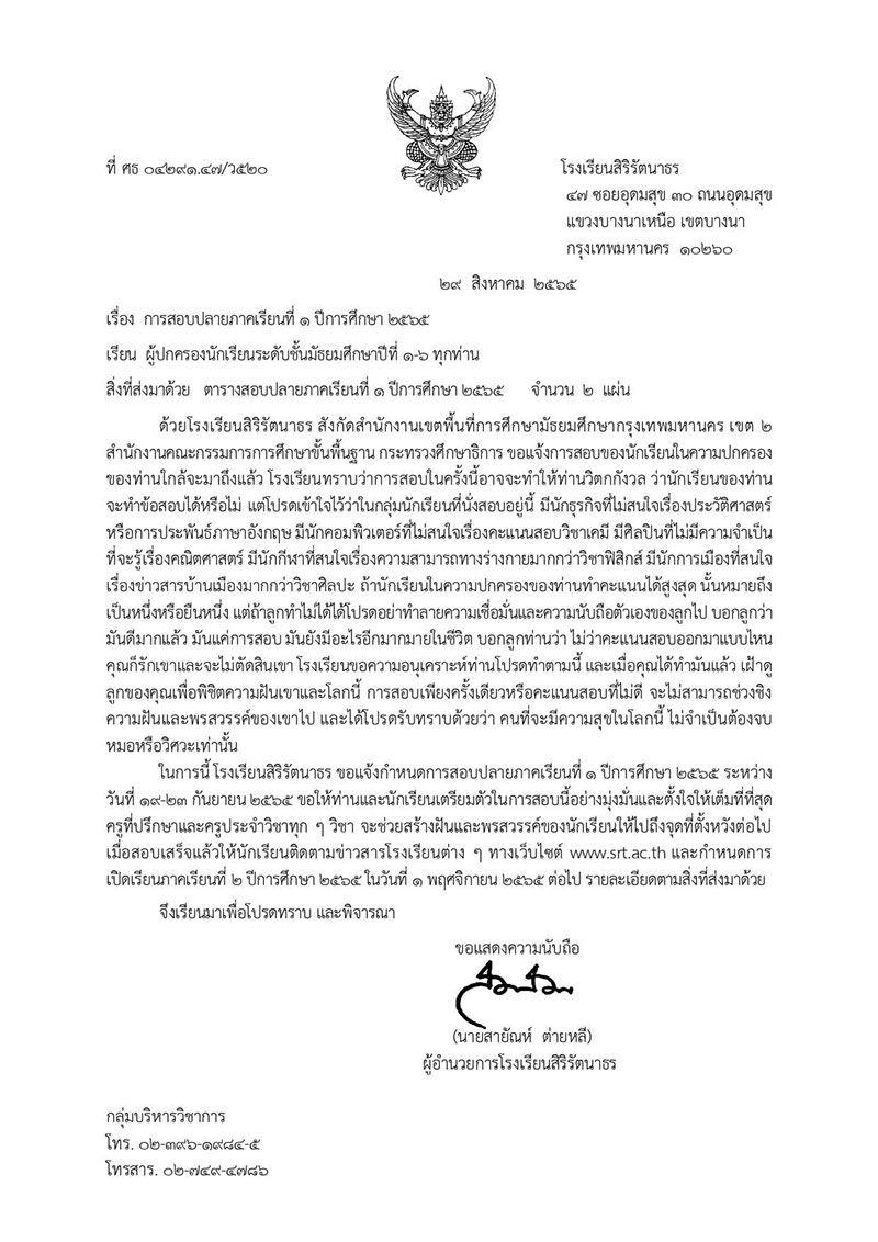 เอกสารดังกล่าวได้ส่งถึงผู้ปกครองนักเรียนระดับชั้น ม.1-6 ทุกคน เพื่อแจ้งเรื่องการสอบปลายภาคเรียนที่ 1 ปีการศึกษา 2565 โดยระบุว่า ด้วยโรงเรียนสิริรัตนาธร สังกัดสำนักงานเขตพื้นที่การศึกษามัธยมศึกษากรุงเทพมหานคร เขต 2 สำนักงานคณะกรรมการการศึกษาขั้นพื้นฐาน กระทรวงศึกษาธิการ ขอแจ้งการสอบของนักเรียนในความปกครองของท่านใกล้จะมาถึงแล้ว โรงเรียนทราบว่าการสอบในครั้งนี้อาจจะทำให้ท่านวิตกกังวลว่านักเรียนของท่านจะทำข้อสอบได้หรือไม่