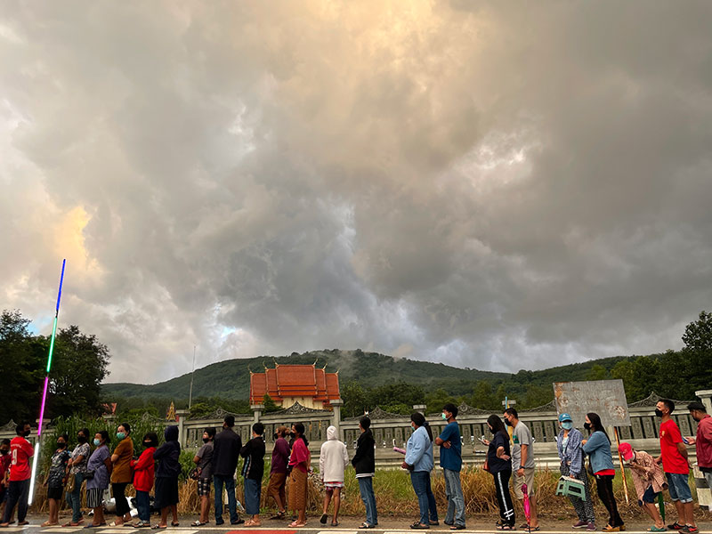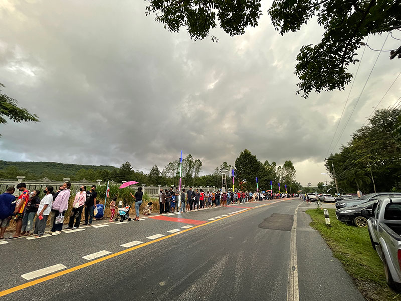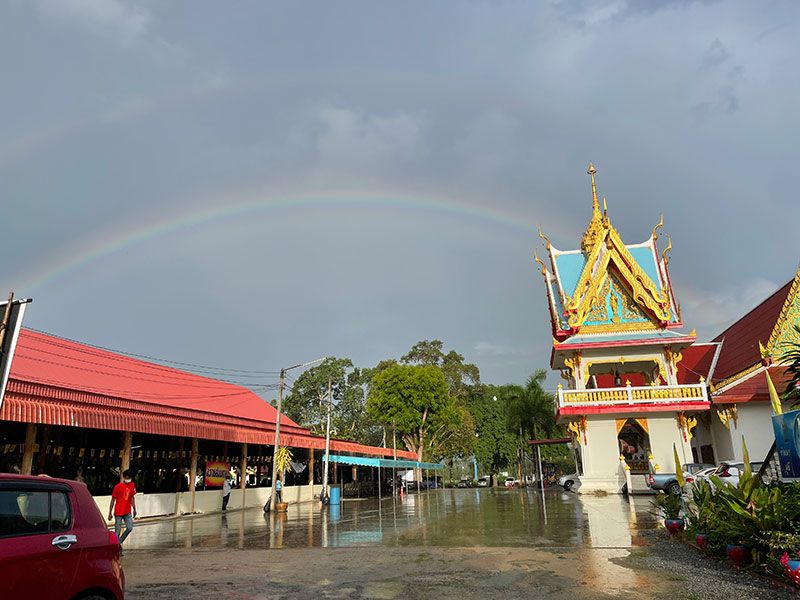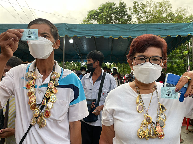 บรรยากาศตั้งแต่เช้าที่ด้านหน้าวัด พบว่าประชาชนต่างหลั่งไหลมาจากทั่วทุกสารทิศอุ้มลูกจูงหลาน มากันทั้งครอบครัวยืนเข้าแถวเรียงหนึ่งตั้งแต่ 04.00 น. แถวยาวจากหน้าประตูวัดทั้งสองด้านยาวต่อกันหลายกิโลเมตร ท่ามกลางท้องฟ้าที่มืดคลึ้ม เมื่อถึงเวลา 06.00 น. เปิดให้รับบัตรคิวก็ทยอยเดินเข้าด้านในผ่านจุดคัดกรองทีละคนทุกคนสวมหน้ากากอนามัยแสดงผลตรวจเอทีเคตามระเบียบกติกา เมื่อรับบัตรคิวจนครบจำนวน 2,000คิว ประชาชนทั้งหมดเข้าไปนั่งเรียงแถวภายในศาลา ปรากฏว่าฝนตกลงมาอย่างหนัก เมื่อฝนจางพบว่าบนท้องฟ้ามีสายรุ้งครอบคลุมบริเวณวัดอย่างเห็นได้ชัดและสายรุ้งยังมองเห็นว่าเป็นสองชั้น น่าอัศจรรย์