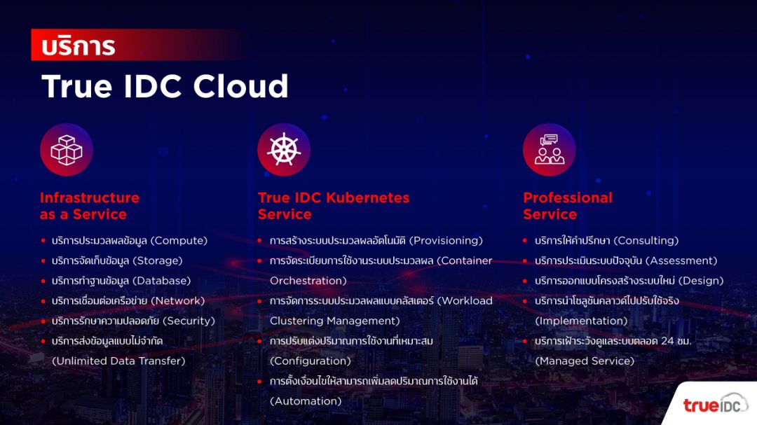 ทรู ไอดีซี พบว่าตลาดคลาวด์ในประเทศไทยมีมูลค่าการเติบโตสูงถึง 25,550 ล้านบาท และมีอัตราการเติบโตอยู่ที่เติบโต 18.79%ในอีก 3-5 ปีข้างหน้าซึ่งสะท้อนความต้องการของผู้ใช้งานที่เติบโตขึ้นอย่างต่อเนื่องจึงได้ลงทุนพัฒนาทั้งระบบคลาวด์และทีมงานสนับสนุนเพื่อมาตอบสนองตลาดไม่เพียงเท่านี้ จากประสบการณ์การให้บริการระบบคลาวด์ชั้นนำมาอย่างยาวนานทรู ไอดีซีพบว่าธุรกิจไทยยังคงมีช่องว่างความต้องการใช้งานระบบคลาวด์ที่สามารถเชื่อมต่อและส่งผ่านข้อมูลได้อย่างรวดเร็ว มีความหน่วงต่ำ หรือ Low Latency มีค่าใช้จ่ายในการถ่ายโอนข้อมูลต่ำสามารถปรับลดขนาดการใช้งานได้อัตโนมัติ มีความปลอดภัยสูง และมีความต้องการจัดเก็บข้อมูลสำคัญให้อยู่ในประเทศ เช่น อุตสาหกรรมการเงินการธนาคาร อุตสาหกรรมบันเทิงและบริการคอนเทนต์ อุตสาหกรรมการผลิตที่มีการใช้งานร่วมกันอุปกรณ์ไอโอที และอุตสาหกรรมอื่น ๆ โดยทรู ไอดีซีคลาวด์เป็นระบบคลาวด์สาธารณะในประเทศ (Domestic Public Cloud) ที่ถูกออกแบบและพัฒนามาเพื่อตอบสนองความต้องการเหล่านี้ให้ธุรกิจไทยสามารถเพิ่มพูนประสิทธิภาพของระบบไอที ลดข้อกำจัดในการดำเนินธุรกิจ การันตีความต่อเนื่องของการให้บริการสูงถึง 99.95%อีกทั้งยังเหมาะสมกับการใช้งานเพื่อรองรับการพัฒนาแอปพลิเคชันในรูปแบบการแบ่งระบบเป็นส่วนย่อย(Microservices)ที่สามารถทำงานบนบริการ True IDC Kubernetes Service ได้สะดวกและมีประสิทธิภาพสูงกว่าการใช้งานคลาวด์ในรูปแบบ Infrastructure-as-a-Service โดยทั่วไป โดยบริการนี้จะพร้อมให้บริการตั้งแต่วันที่ 1 กันยายน 2565 เป็นต้นไป