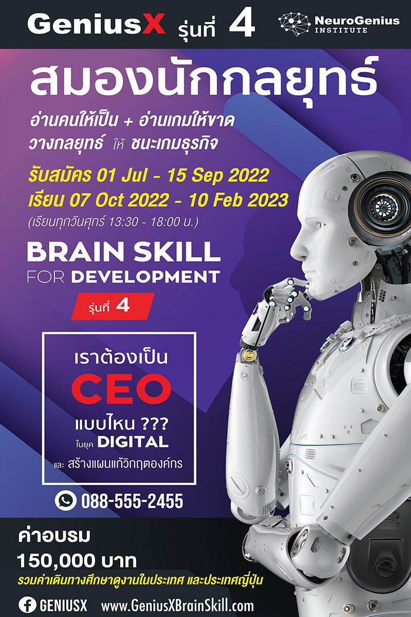 โดยรายละเอียดการเรียนหลักสูตร GeniusX Brain Skill Development เรียนทุกวันศุกร์ ระยะเวลา 14 สัปดาห์ ตั้งแต่วันศุกร์ที่ 7 ตุลาคม 2565 – 10 กุมภาพันธ์ 2566และสามารถสมัครเรียนได้ตั้งแต่วันนี้ – 15ก.ย. 2565https://www.neurogenius.com/geniusx/x4ค่าอบรม150,000 บาท รวมค่าศึกษาดูงานในประเทศ 3 วัน 2 คืน และประเทศญี่ปุ่น 4 วัน 3 คืน