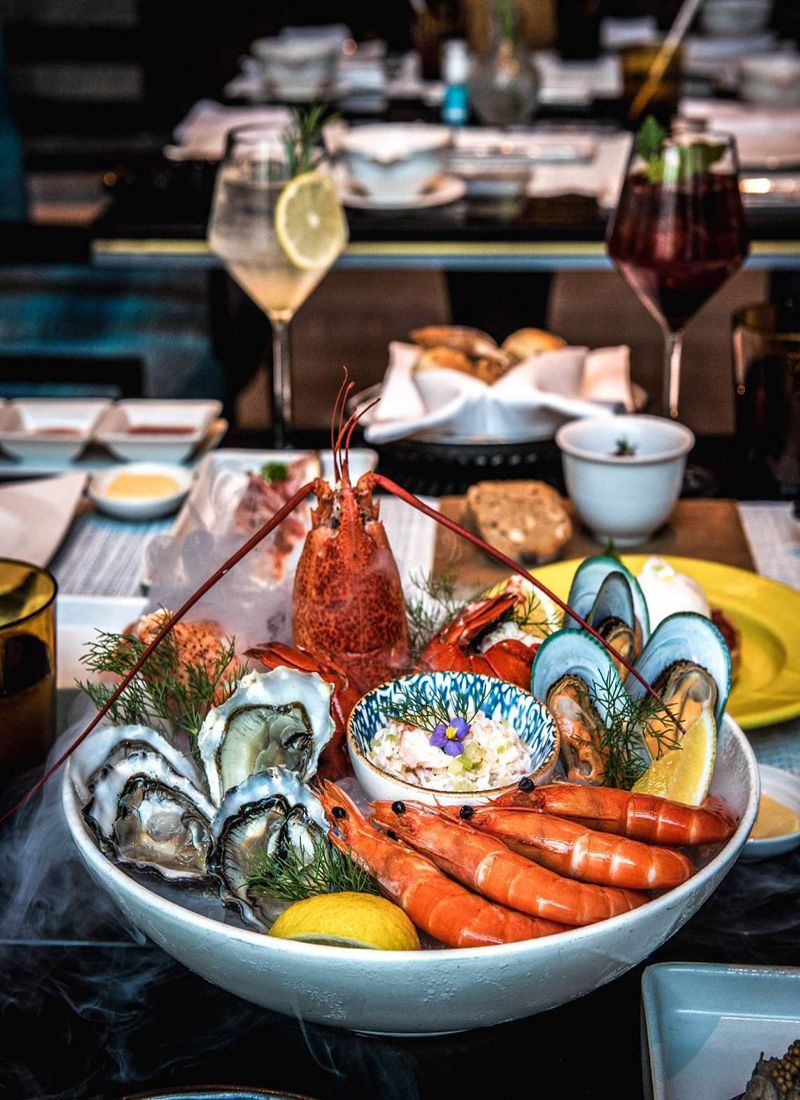 เริ่มต้นมื้ออาหาร ในบรรยากาศสบายๆ ช่วงสายของวันอาทิตย์ ด้วยเมนูจานต้อนรับ ซีฟู้ดแพลตเตอร์ (seafood platter) เสิร์ฟอาหารทะเลรวม 5 ชนิด ประกอบไปด้วย หอยนางรมฝรั่งเศส กุ้งล็อบสเตอร์นำเข้าจากมหาสมุทรแอตแลนติก รีมูเลดปู กุ้งและหอยแมลงภู่นิวซีแลนด์ ตามด้วยเมนูซุปล็อบสเตอร์บิสก์ท็อปด้วยวิบครีมสดเสิร์ฟ ให้อิ่มอร่อยพร้อมกันทั้งโต๊ะอาหาร