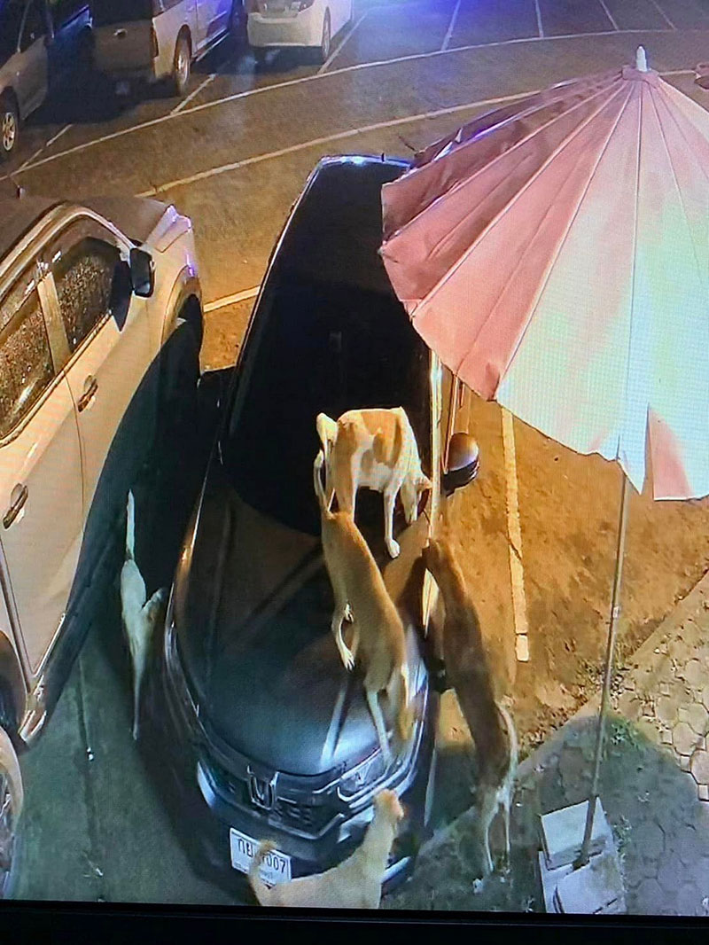 25 กันยายน 2565 ผู้สื่อข่าวรายงานว่า โลกออนไลน์ผู้ใช้เฟสบุ๊ค Tongta Somboon นำคลิปวีดีโอภาพจากกล้องวงจรปิด มาโพสต์ลงในเฟสบุ๊คส่วนตัว ซึ่งคลิปดังกล่าวเป็นคลิปขณะสุนัขจรจัดจำนวน 5 ตัว ปีนขึ้นลงรถยนต์เก๋งที่จอดเอาไว้หน้าบ้านทำให้กระโปรงหน้ารถยนต์ได้รับความเสียหาย จากการที่ถูกเล็บของสุนัขขีดข่วน สำหรับคลิปดังกล่าวมีความยาว 4 วินาที