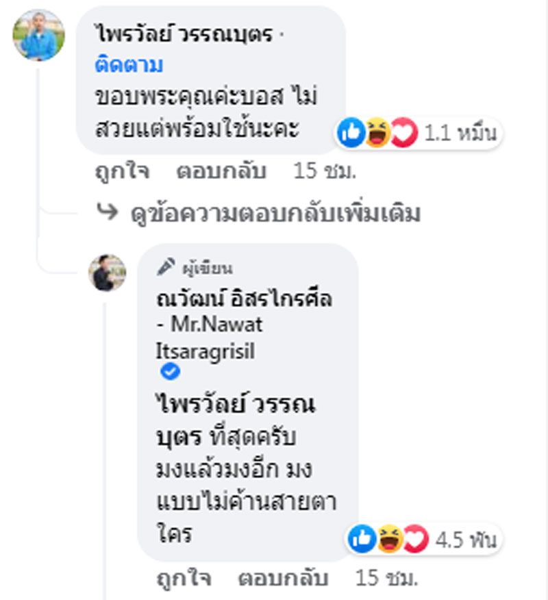 ล่าสุด ณวัฒน์ อิสรไกรศีล บอสใหญ่แห่งเวที Miss Grand เผยภาพและข้อความ ระบุว่า “มงลง ขอแสดงความยินดีกับ มิสแกรนด์เปรียญ๙ ชนะขาดในรอบตอบคำถาม” ซึ่งก็ทำให้ แพรรี่ หรือ ไพรวัลย์ วรรณบุตร เข้ามาตอบกลับโพสต์นี้ว่า “ขอบพระคุณค่ะบอส ไม่สวยแต่พร้อมใช้นะคะ” -009