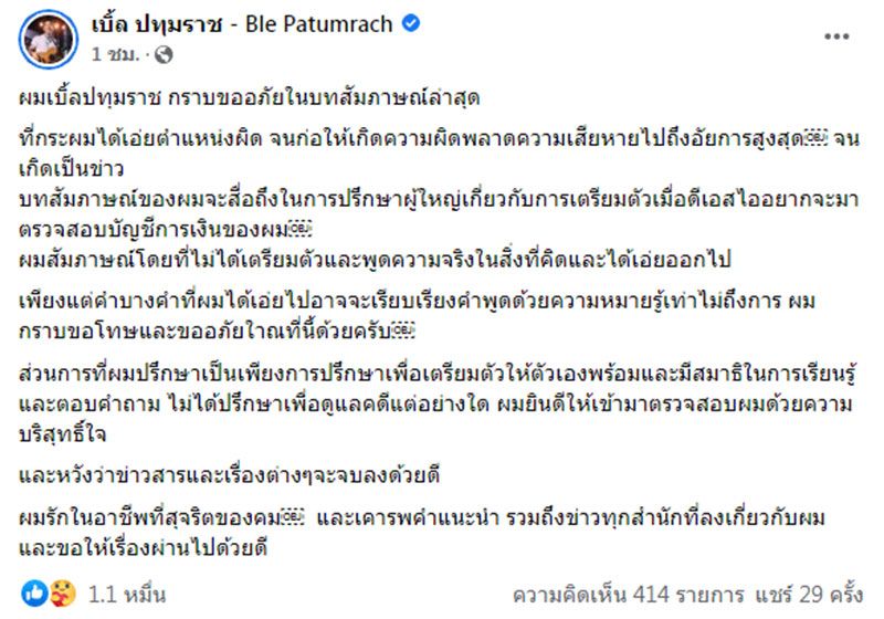 ล่าสุด นักร้องหนุ่ม เบิ้ล ปทุมราช ก็ออกมาชี้แจงว่า “ผม เบิ้ล ปทุมราช กราบขออภัยในบทสัมภาษณ์ล่าสุด ที่กระผมได้เอ่ยตำแหน่งผิด จนก่อให้เกิดความผิดพลาดความเสียหายไปถึงอัยการสูงสุด จนเกิดเป็นข่าว บทสัมภาษณ์ของผมจะสื่อถึงในการปรึกษาผู้ใหญ่เกี่ยวกับการเตรียมตัวเมื่อดีเอสไออยากจะมาตรวจสอบบัญชีการเงินของผม