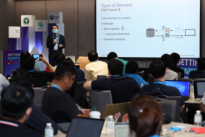 ด้านนายแพทย์รัฐ ปัญโญวัฒน์ ผู้ช่วยผู้จัดการ สำนักพัฒนามาตรฐานระบบข้อมูลสุขภาพไทย (สมสท.) หนึ่งในวิทยากรผู้เชี่ยวชาญในด้าน FHIR profiling & SNOMED-CT สอนเวิร์กชอปในงานนี้ กล่าวว่า“ทาง สมสท. เป็นหน่วยงานที่มีความแข็งแรงในด้านการเก็บข้อมูลสุขภาพในไทย จากการศึกษาเรื่องมาตรฐานการเชื่อมต่อระบบ“ข้อมูล” พบว่า FHIRนั้นถูกออกแบบมาได้ค่อนข้างสมบูรณ์ ใช้งานได้ง่าย อีกทั้งยังมีเครื่องมือต่างๆรองรับจำนวนมาก ทาง สมสท.เล็งเห็นว่าระบบนี้จะเป็นเครื่องมือที่เพิ่มความสะดวกให้แก่หน่วยงานที่เกี่ยวข้องที่จำเป็นต้องใช้ได้เป็นอย่างดี พร้อมทั้งได้ผลักดันให้หน่วยงานภาครัฐโดยเฉพาะกระทรวงสาธารณสุขได้นำไปพิจารณาในการยกระดับเพื่อการพัฒนาเชื่อมต่อฐาน“ข้อมูลสุขภาพ”โดยรวมเรียบร้อยแล้ว และสำหรับการจัดงานเผยแพร่ความรู้ในครั้งนี้มีผู้คนสนใจมาร่วมเวิร์กชอปเป็นจำนวนมาก ต่อจากนี้ไปทั้ง 2 ภาคส่วนนี้ คงต้องทำงานควบคู่สอดรับกันไปเรื่อยๆเพื่อร่วมกันพลิกโฉมระบบสาธารณสุขไทยในทุกมิติให้เกิดขึ้นครับ”