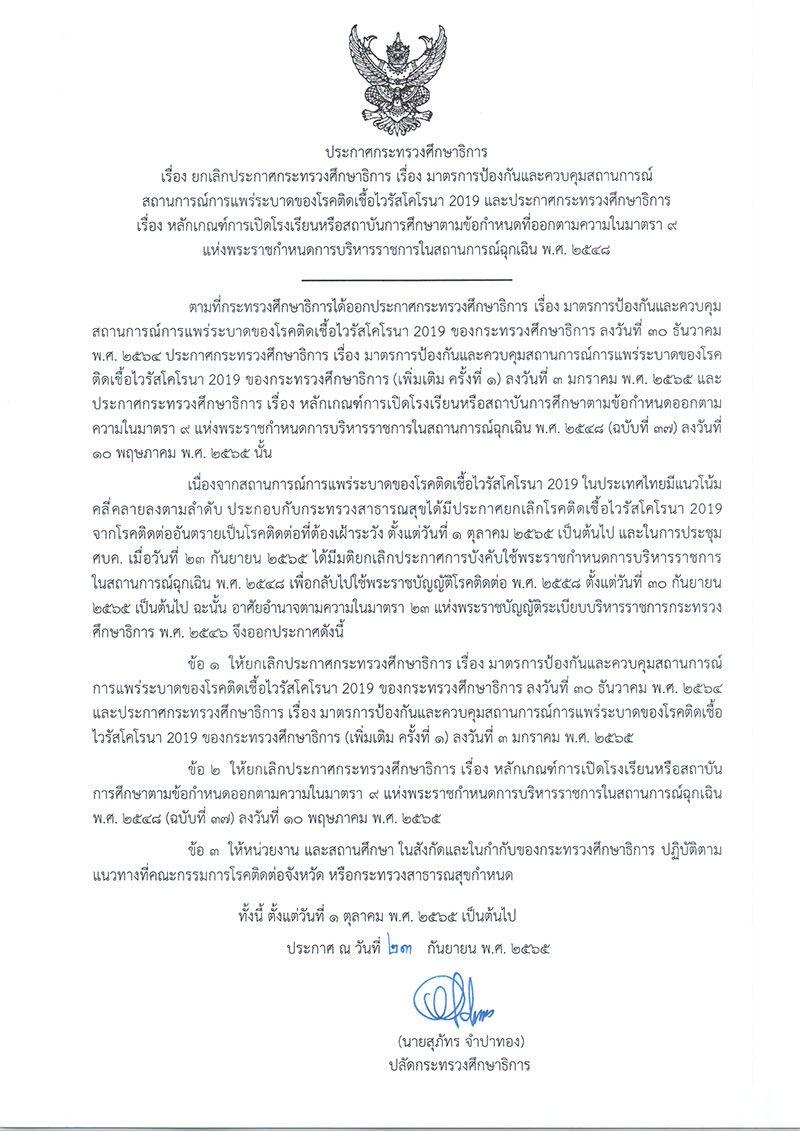 วันที่ 27 กันยายน 2565 นายสุภัทร จำปาทอง ปลัดกระทรวงศึกษาธิการ ลงนามยกเลิกประกาศกระทรวงศึกษาธิการ เรื่องมาตรการป้องกันและควบคุมสถานการณ์การแพร่ระบาดของโรคติดเชื้อไวรัสโคโรนา 2019 และประกาศกระทรวงศึกษาธิการ เรื่อง หลักเกณฑ์การเปิดโรงเรียนหรือสถานบันการศึกษาตามข้อกำหนด พ.ร.ก.ฉุกเฉิน