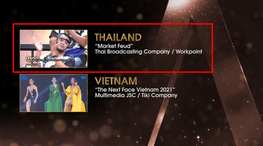 โดยช่องเวิร์คพอยท์ หมายเลข 23 ได้รับการตัดสินให้เป็นผู้ชนะเลิศเป็นตัวแทนประเทศไทยเข้าไปชิง 3 รางวัลสุดยิ่งใหญ่ระดับเอเชียคือ รายการ “ปัญญาตลาดแตก” เข้าชิงรางวัล Best Non-Scripted Entertainment,รายการ “ไมค์หมดหนี้ เสี่ยงโชค” เข้าชิงรางวัล Best Music or Dance Programmeและรายการ “ศึกมายากลMagic Wars” เข้าไปชิงรางวัลประเภทBest General Entertainment ,Game or Quiz Programmeซึ่งในรอบตัดสินระดับเอเชีย จะมีผู้เข้าแข่งขันทั้งหมดจาก 16 ประเทศในเอเชียแปซิฟิก อาทิ ไทย, ออสเตรเลีย ,นิวซีแลนด์ ,บังคลาเทศ, จีน, ฮ่องกง, อินเดีย, อินโดนีเซีย,ญี่ปุ่น, เกาหลีใต้, มาเลเซีย, ฟิลิปปินส์ ,สิงคโปร์ , เวียดนาม ,ไต้หวัน และเมียนมาร์
