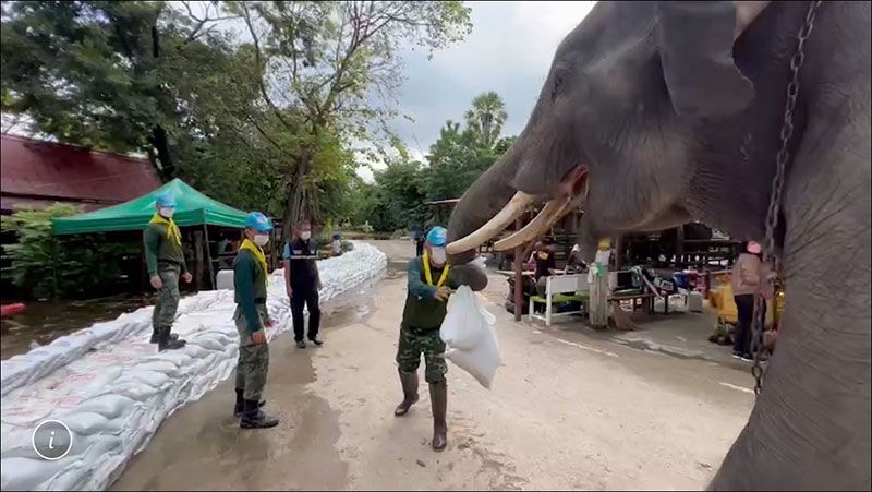 ได้เอ่อเข้าท่วมบริเวณที่ทำการของวังช้างอยุธยาแลเพนียด ในหมู่บ้านช้าง หมู่ 3 ต.สวนพริก บรรดาควาญช้างและคนงานต่างช่วยกันกรอกกระสอบทราย ร่วมกับทหารจิตอาสาจากกองพันทหารม้าที่ 11 กรมทหารม้าที่ 4 รักษาพระองค์ นำโดย พ.ท.กฤษฏา พงศ์เลิศโกศล ผู้บังคับกองพัน นำกระสอบทรายปิดกั้นน้ำไม่ให้เข้าท่วมบริเวณสถานที่เลี้ยงช้าง โดยเฉพาะช้างน้อย ซึ่งมีช้างของวังช้างอยุธยามาช่วยขนกระสอบทรายด้วย